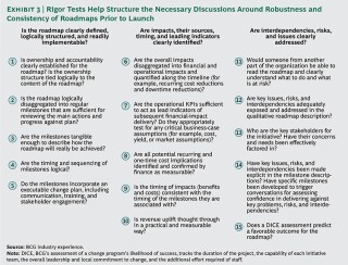 To ensure that roadmaps are sufficiently detailed and robust, many high-performing PMOs utilize some form of a "rigor test" earlier an initiative tin can exist launched. A rigor test should be designed to decide whether the roadmap underpinning an initiative is sufficiently articulate and whether information technology provides links to overall impact.
