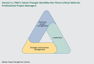 Adopting a more than strategic orientation means that PMOs will need to occupy a new role in the implementation of strategic efforts, which, in turn, requires enhanced capabilities. PMOs must have the right people in place to actually serve as stewards of value in support of strategic initiatives. It is no longer enough to focus talent development just on technical project-management skills. Organizations as well need to develop a portfolio of talented PMO staff with strategic and business direction and leadership skills. (Come across Exhibit v.) PMI's Talent Triangle illustrates the three critical skill sets necessary to drive successful implementation of strategic initiatives. 12 Notes: 12 PMI, Pulse of the Profession In-Depth Report: The Competitive Advantage of Constructive Talent Direction, March 2013.