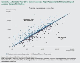 Another critical attribute of tracking progress is the importance of providing a current portfolio view for senior leaders. For example, Exhibit 4 shows BCG'southward analysis of approximately two,000 initiative roadmaps, with US$4 billion in bear on-begetting milestones. Of course, not every individual roadmap for every initiative tin be expected to exist fully delivered. Analysis at the individual roadmap level shows that 35 percent of impact-bearing milestones exceeded plan, 45 pct were within plan, and xx percentage vicious short. Overall, this portfolio of initiatives was successfully delivered, achieving more than 110 percent of the targeted economical value. A portfolio view—with a PMO actively supporting senior-leadership word—ensures that organizations adopt an enterprise-wide perspective. This generates the necessary forward-looking clarity on how the overall program is proceeding against planned impacts, spotlighting areas that crave additional attending and enabling organizations to overdeliver against targets despite inevitable and initially unforeseen implementation shortfalls in individual roadmaps.