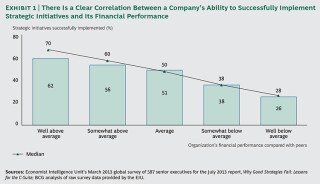 In this surround, if companies are to remain competitive, they must simultaneously optimize both how they run the business and how they alter the business, the latter typically through the development and implementation of programs of new strategic initiatives. Of course, optimizing for existent excellence in both running and changing the business is much easier said than done. The day-to-twenty-four hour period challenges that business leaders face in hitting run-the-business targets, while managing a cornucopia of operational issues, are enormous. Furthermore, delivering on bold change-the-business initiatives is a real challenge to many. Still, coming together this challenge is becoming a competitive necessity. Correctly positioned, supported, and equipped, the PMO can play an important role in helping an organisation encounter this claiming. Assay of research by the EIU shows that at that place is a clear upside for companies that excel at implementing strategic efforts and driving change. (Run into Exhibit 1.)