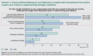 EIU inquiry from 2011 shows that executives consider both of these factors—senior commitment and clear milestones and objectives—critical for the successful delivery of strategic initiatives. And when they are compared with the EIU's 2008 baseline data, it'south clear that these 2 factors are growing in importance. (Run across Showroom two.)